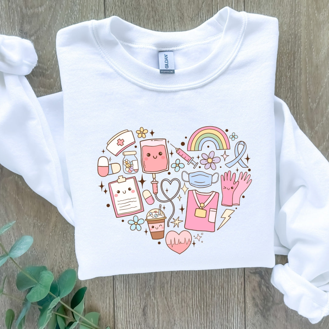 Healthcare Heart Crewneck Sweatshirt Crafted from premium Gildan fabric, this crewneck sweatshirt delivers exceptional durability and comfort for everyday wear. The high-quality direct-to-film (DTF) print ensures vibrant, long-lasting graphics that withstand repeated washing without fading or cracking. The classic crew neckline and relaxed fit provide versatile styling options across casual and professional settings. Please consult the size chart before ordering to ensure the perfect fit for your needs.